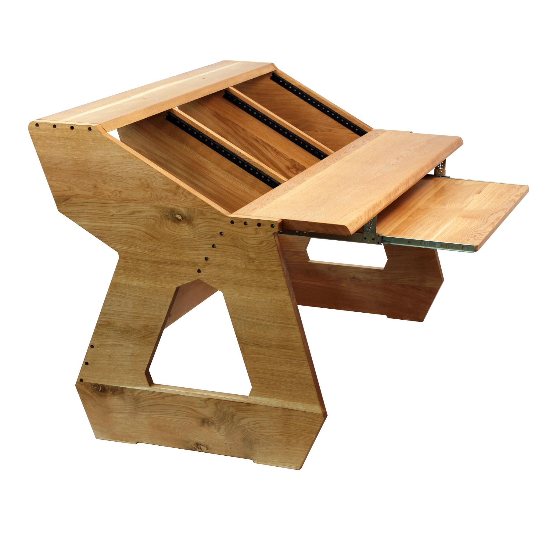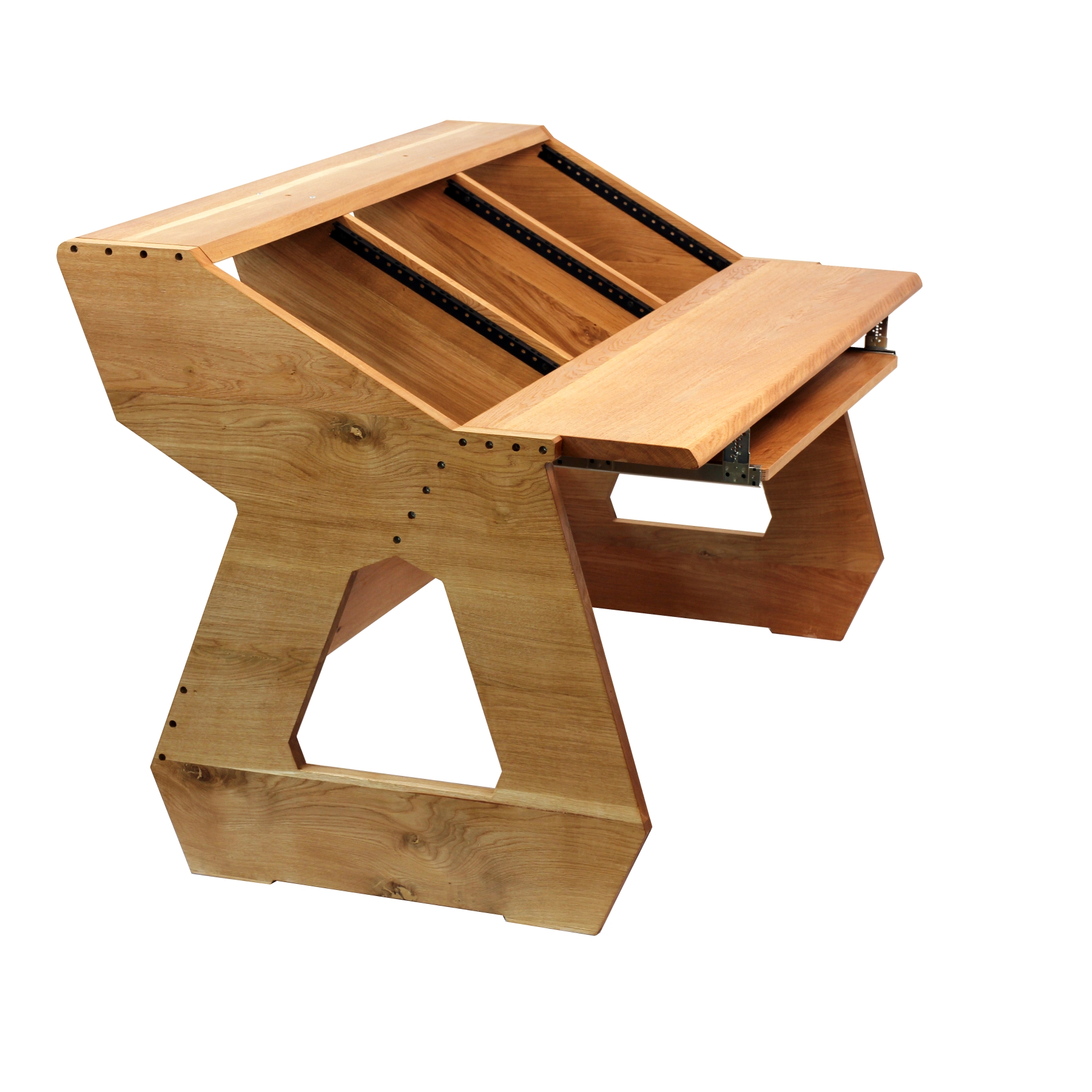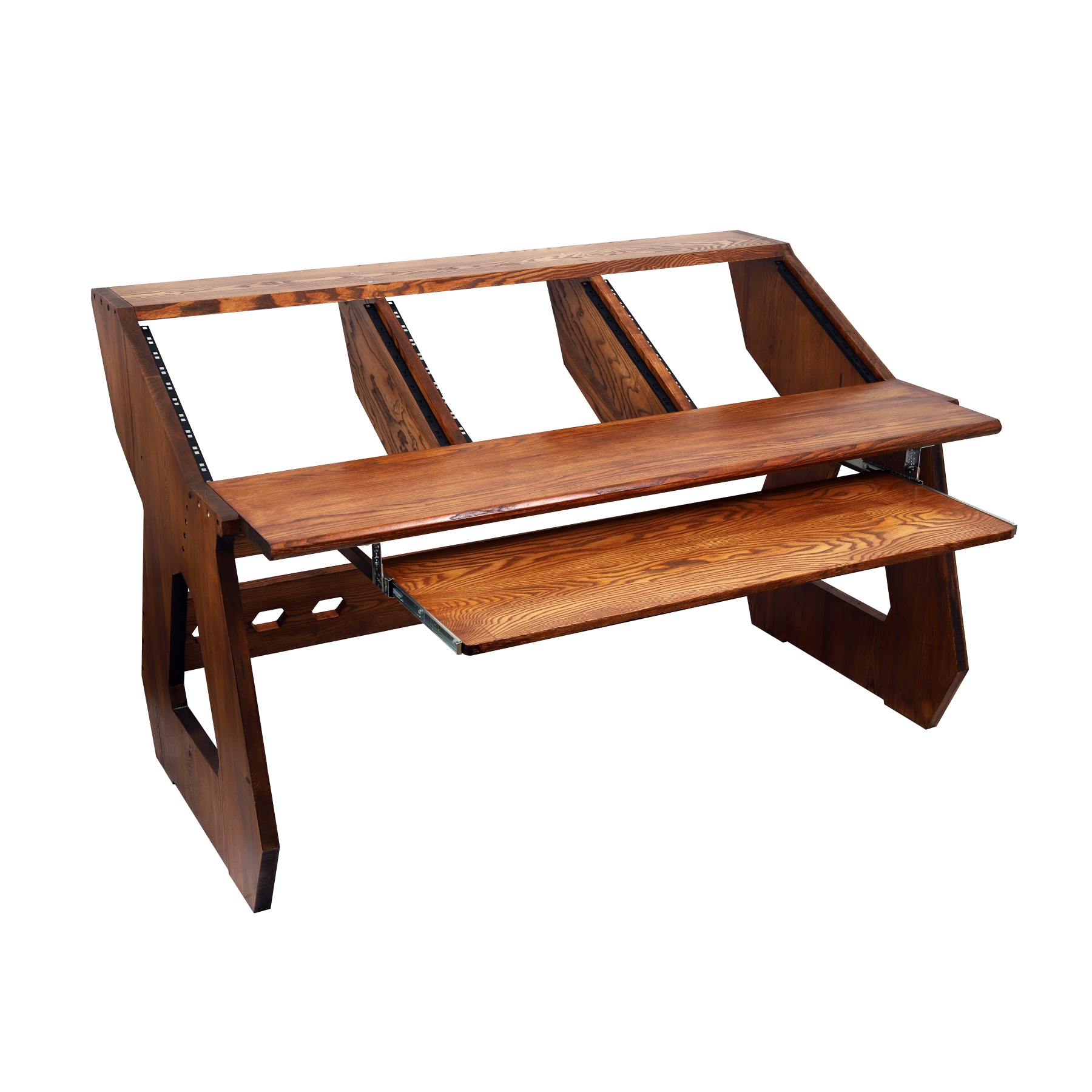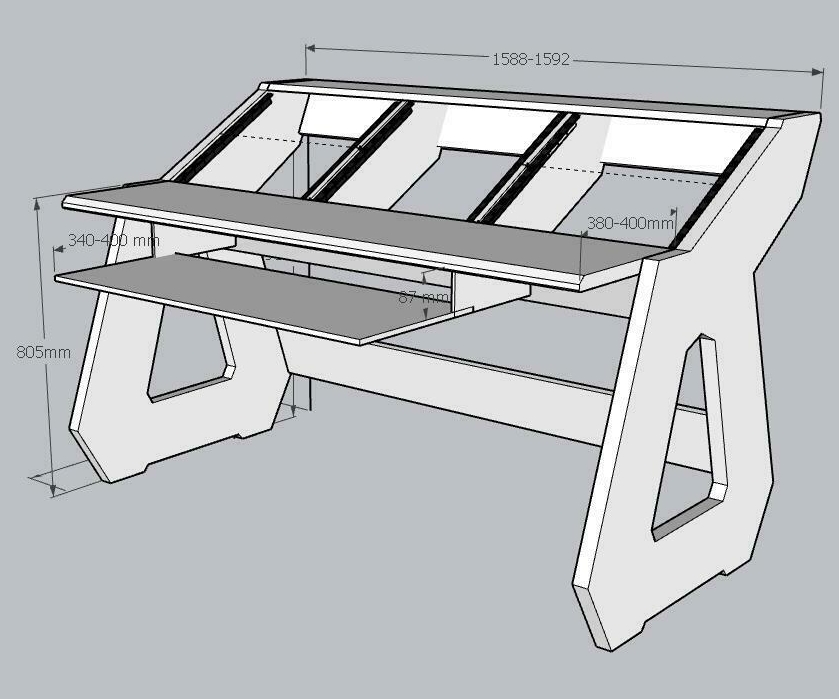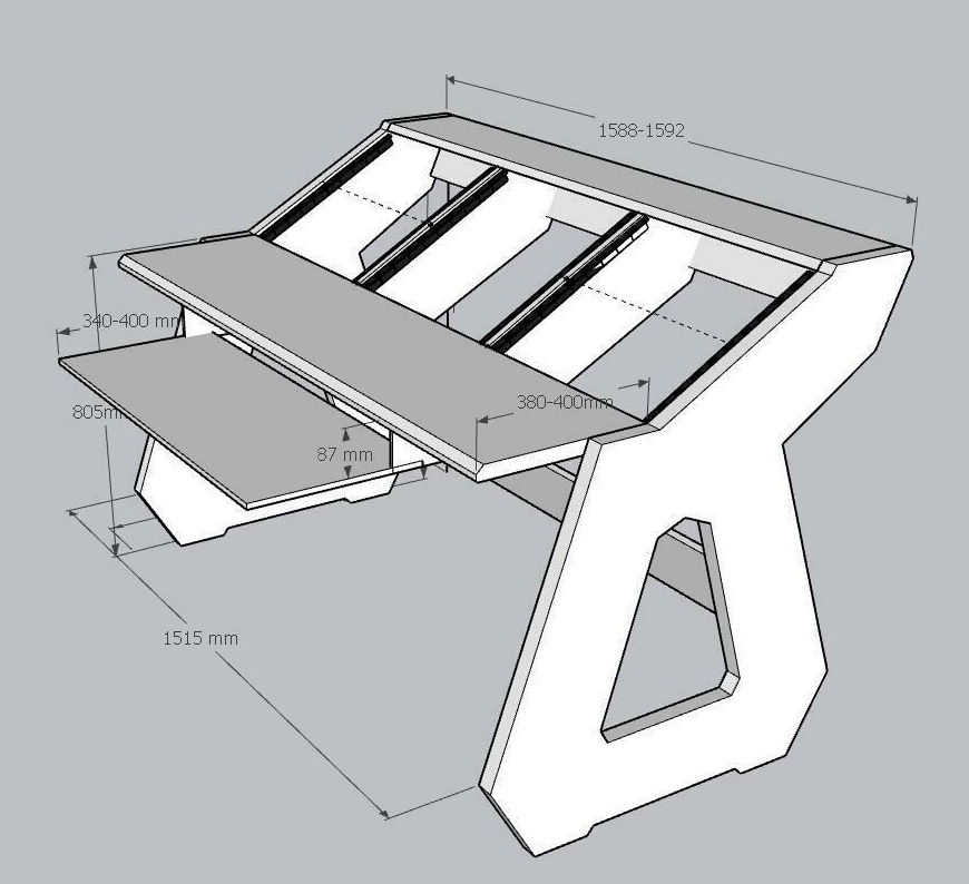 Biurko ma zamontowane szyny rack firmy Adam Hall.