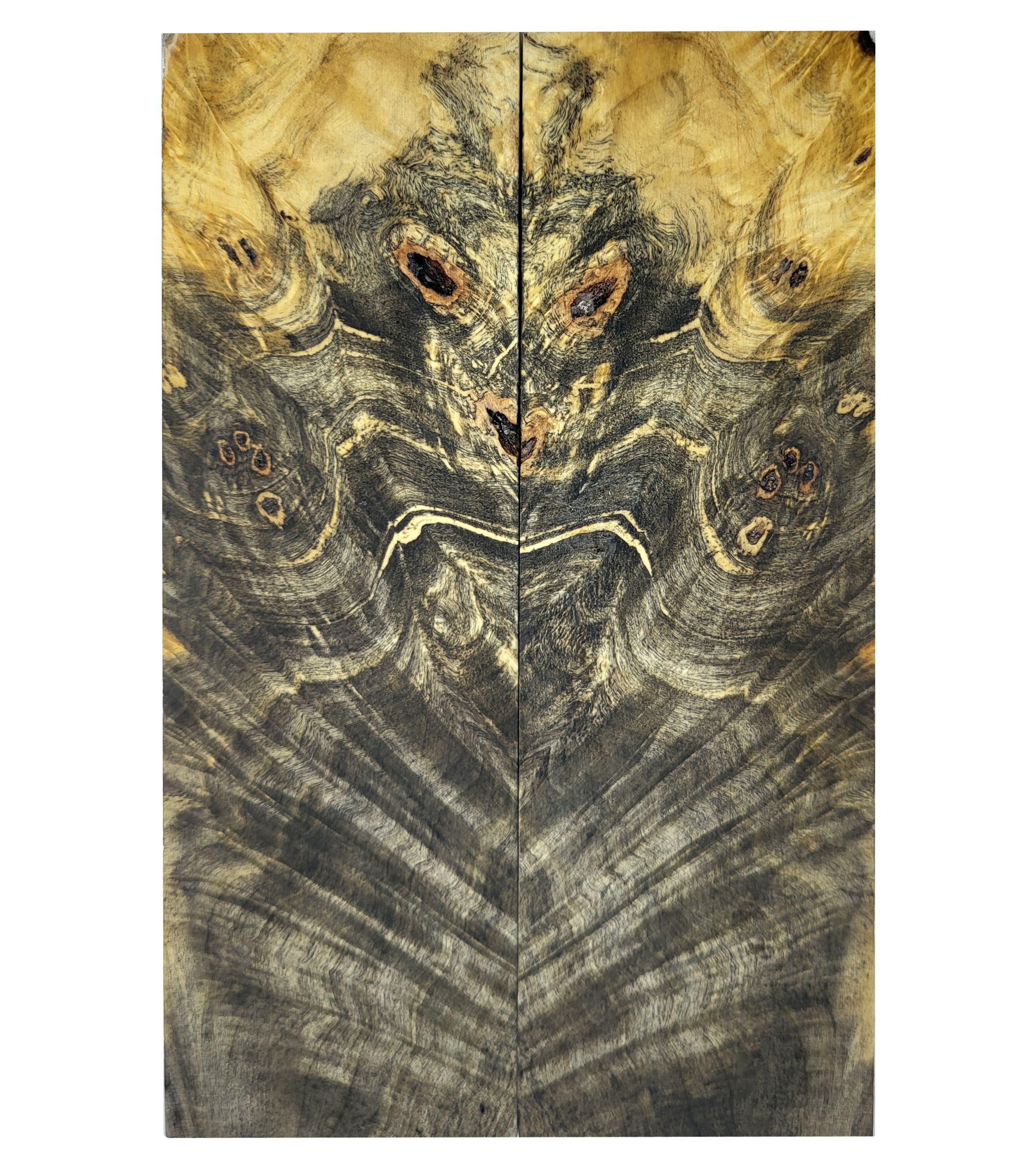 Drewno stabilizowane Buckeye Burl. Jest to czeczot kasztanowca amerykańskiego Okładki symetryczne typu czeczot. Posiada ubytki i wtrącenia kory. wymiary każdej z okładek 8-9 x 54 x 179 mm Jest to jedna z najoryginalniejszych kolorystycznie czeczot na świecie. Po rozcięciu charakteryzujące się wielokolorowym, kontrastowym i zróżnicowanym złoto-rdzawo-czarnym usłojeniem. Występują oczka i złożone słoje. Zdjęcia przedstawiają sprzedawane okładki na mokro i sucho, druga strona na mokro. Oferowane bloczki i okładki są po obróbce na strugarce i grubościówce - jest to odpowiednik papieru ściernego 100-120 . Nie szlifujemy drewna przed wysyłką. Podany wymiar może mieć +/- 2 mm różnicy w podanych wyżej wymiarach.