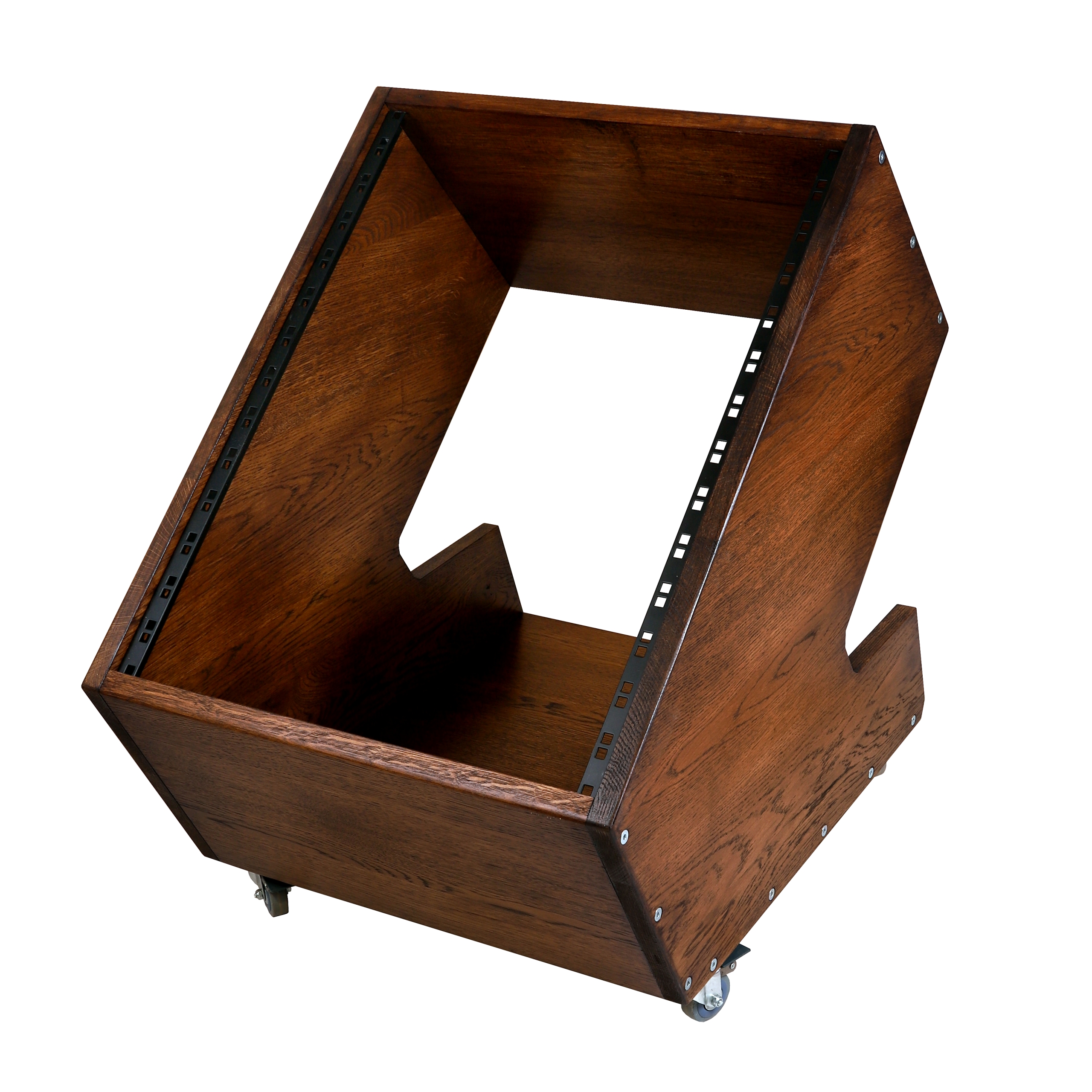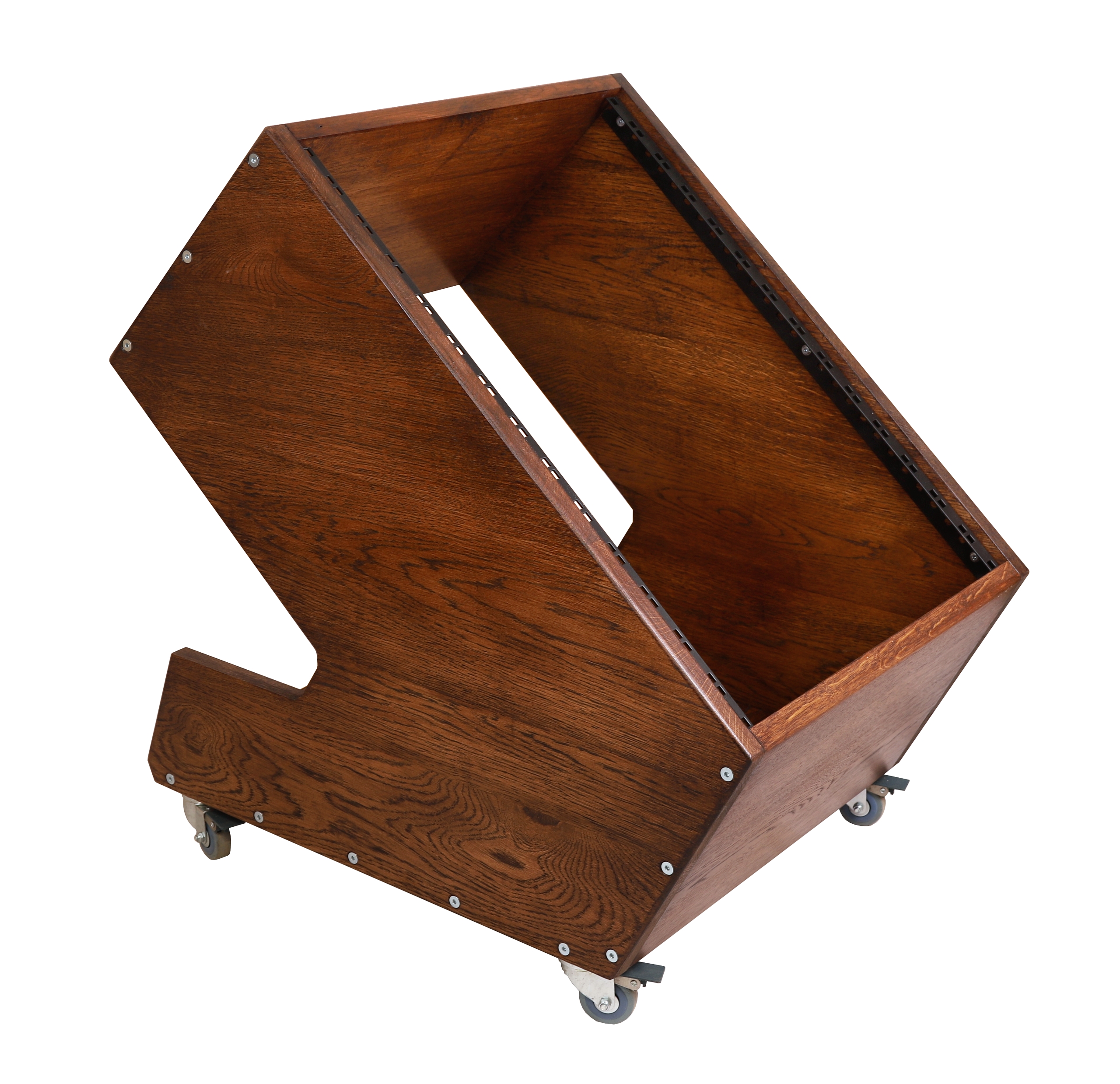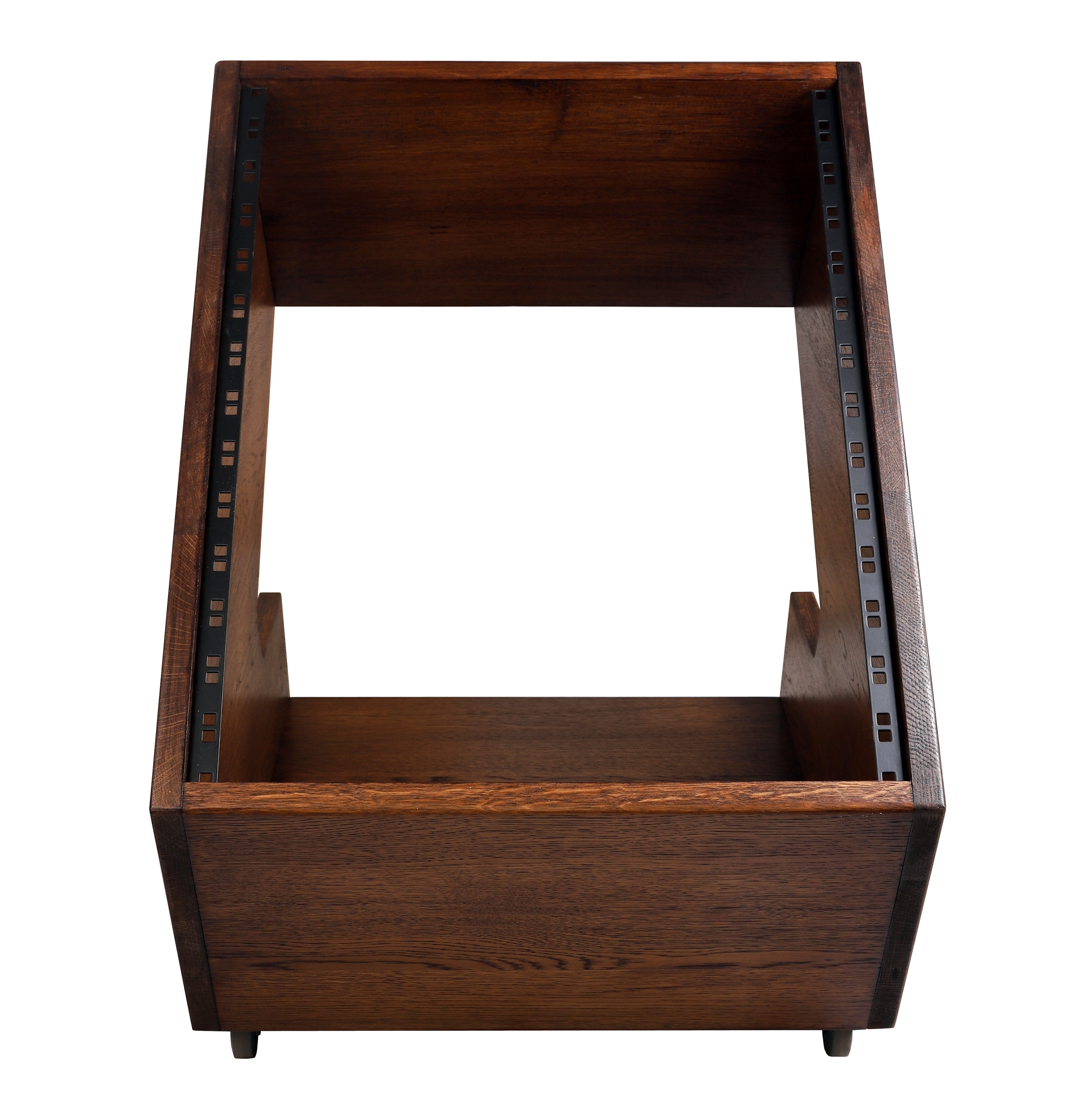 Stojak podłogowy typu rack 19" wykonany z litego drewna dębowego o grubości 22-25 mm.