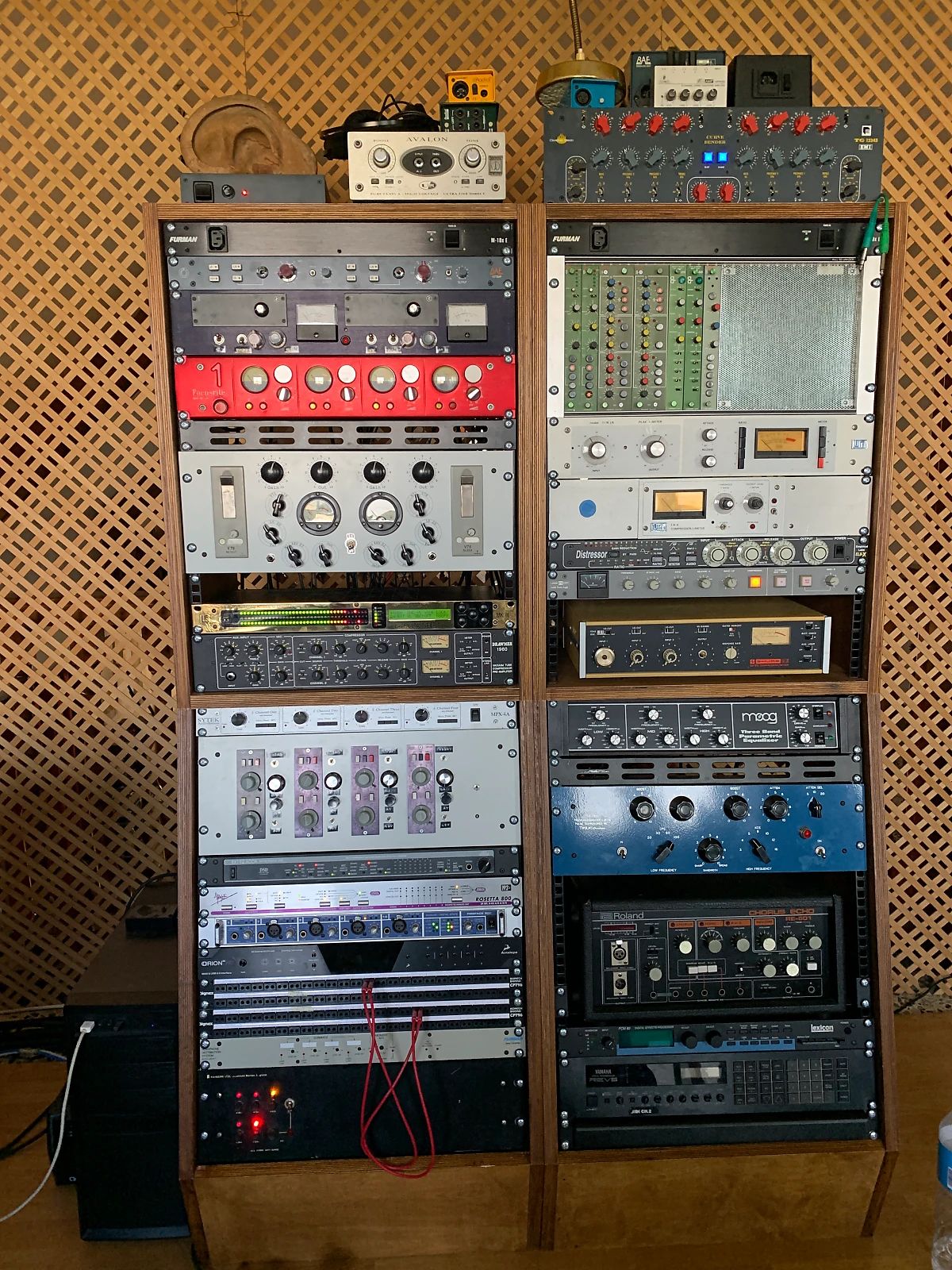 Stojak ma zamontowane szyny rack firmy Adam Hall i gumowe nóżki ( 12-13 mm wysokości)
